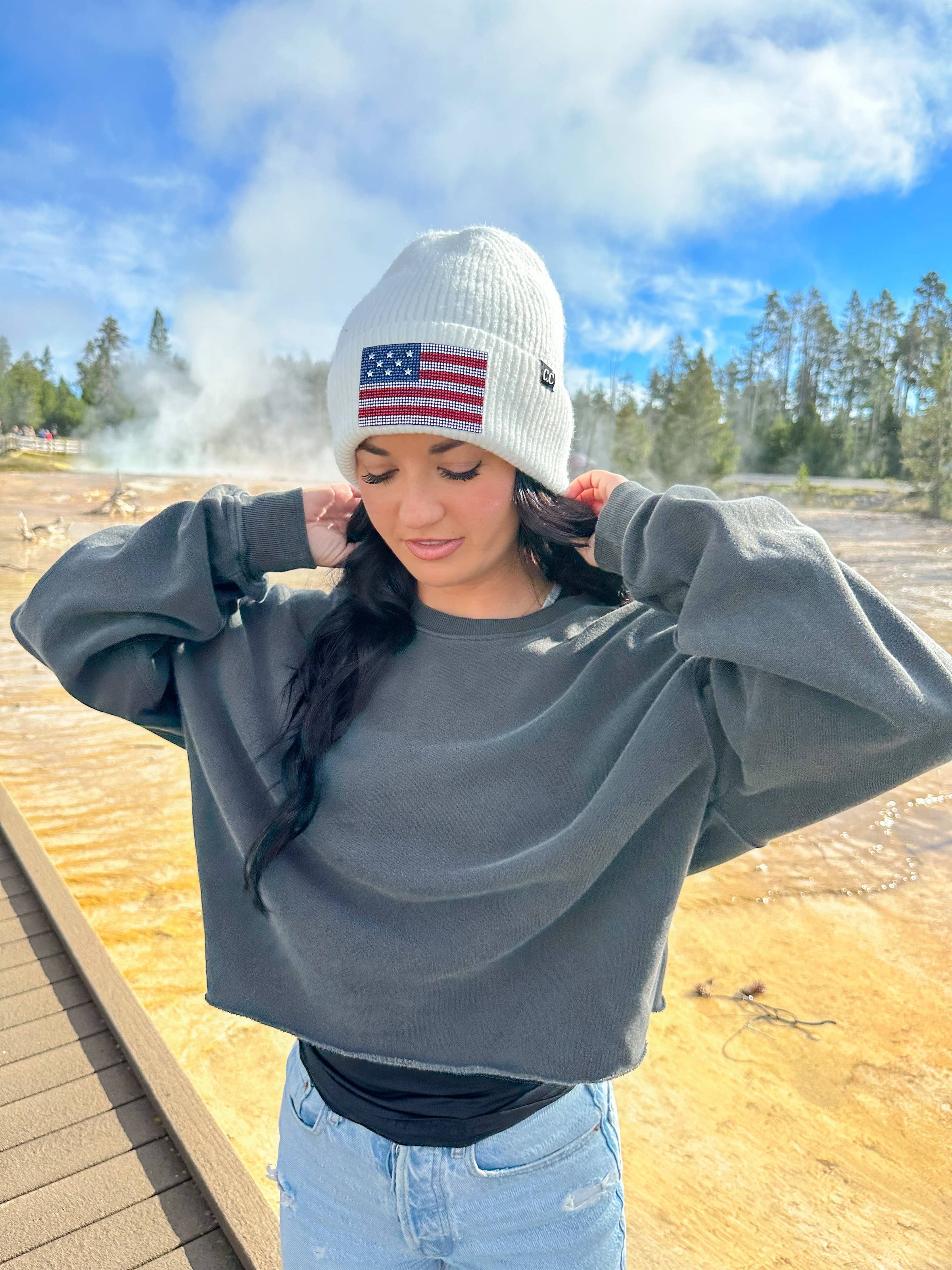 A soft ribbed beanie with a gorgeous rhinestone designed USA Flag! Show off your favorite colors in this patriotic beanie!