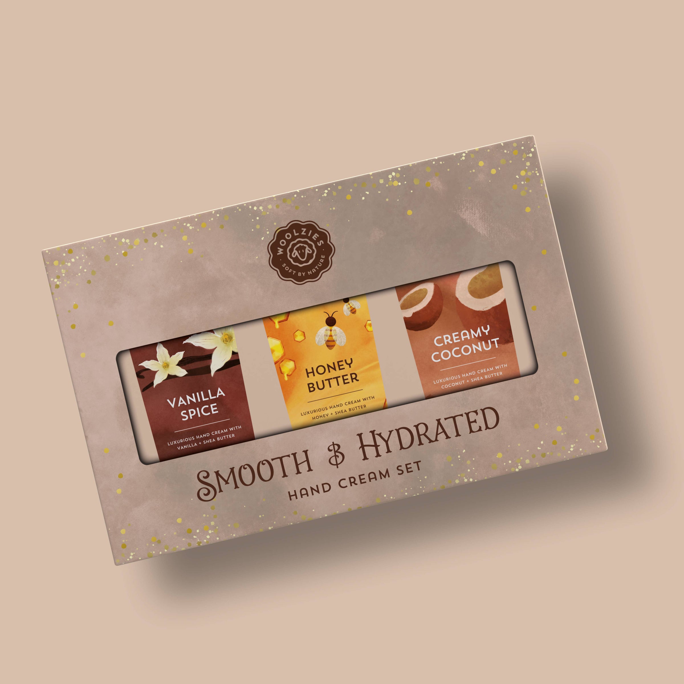 Embrace silky-smooth hands with our Smooth & Hydrated Hand Cream Set, infused with the comforting scents of Vanilla Spice, Honey Butter, and Creamy Coconut. Experience Luxury in every touch.
