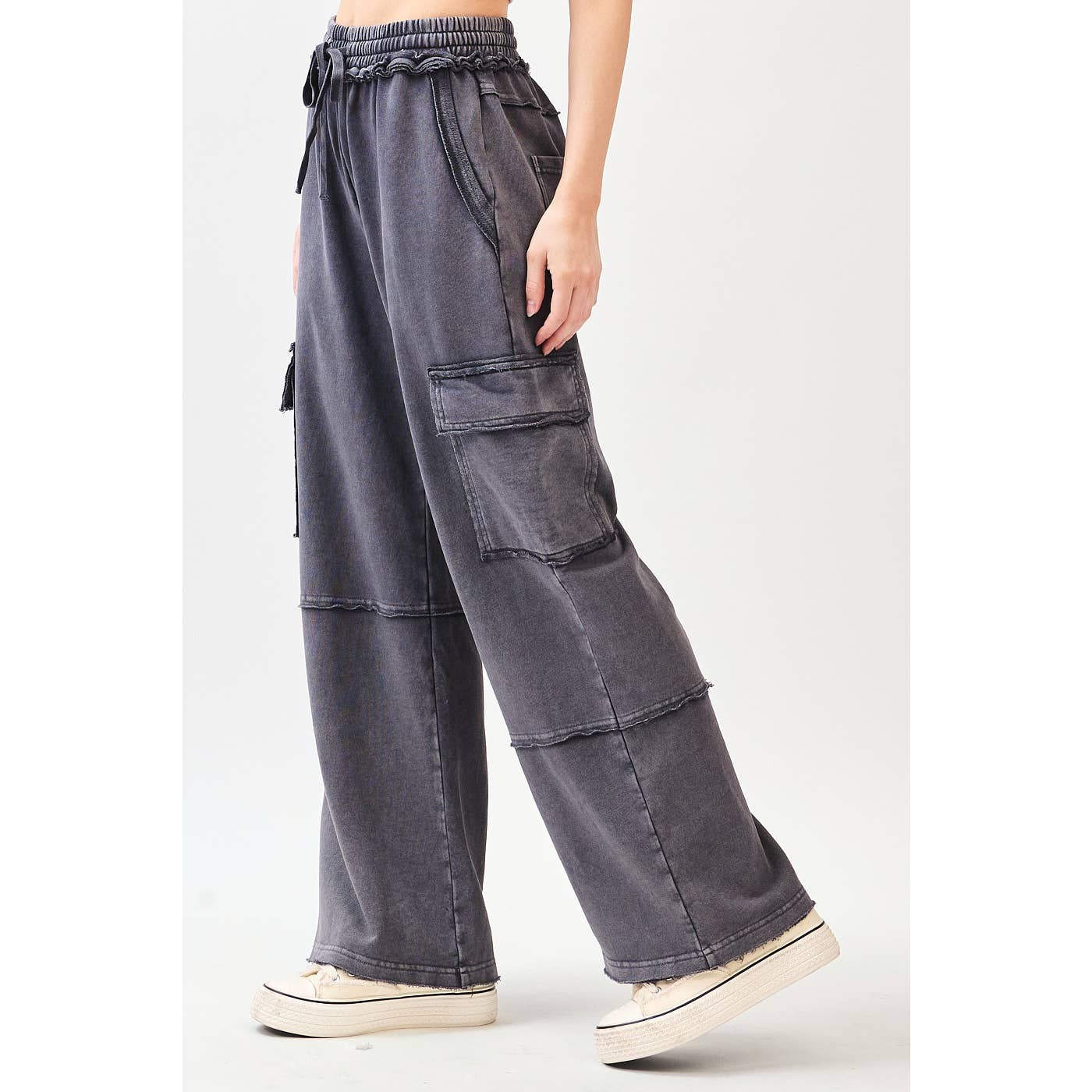 French Terry Fabric; featuring an elastic waist drawstring and mid-rise fit. These Utility Cargo Pants also boast a relaxed fit and very cool vibe! Available in washed charcoal. SML