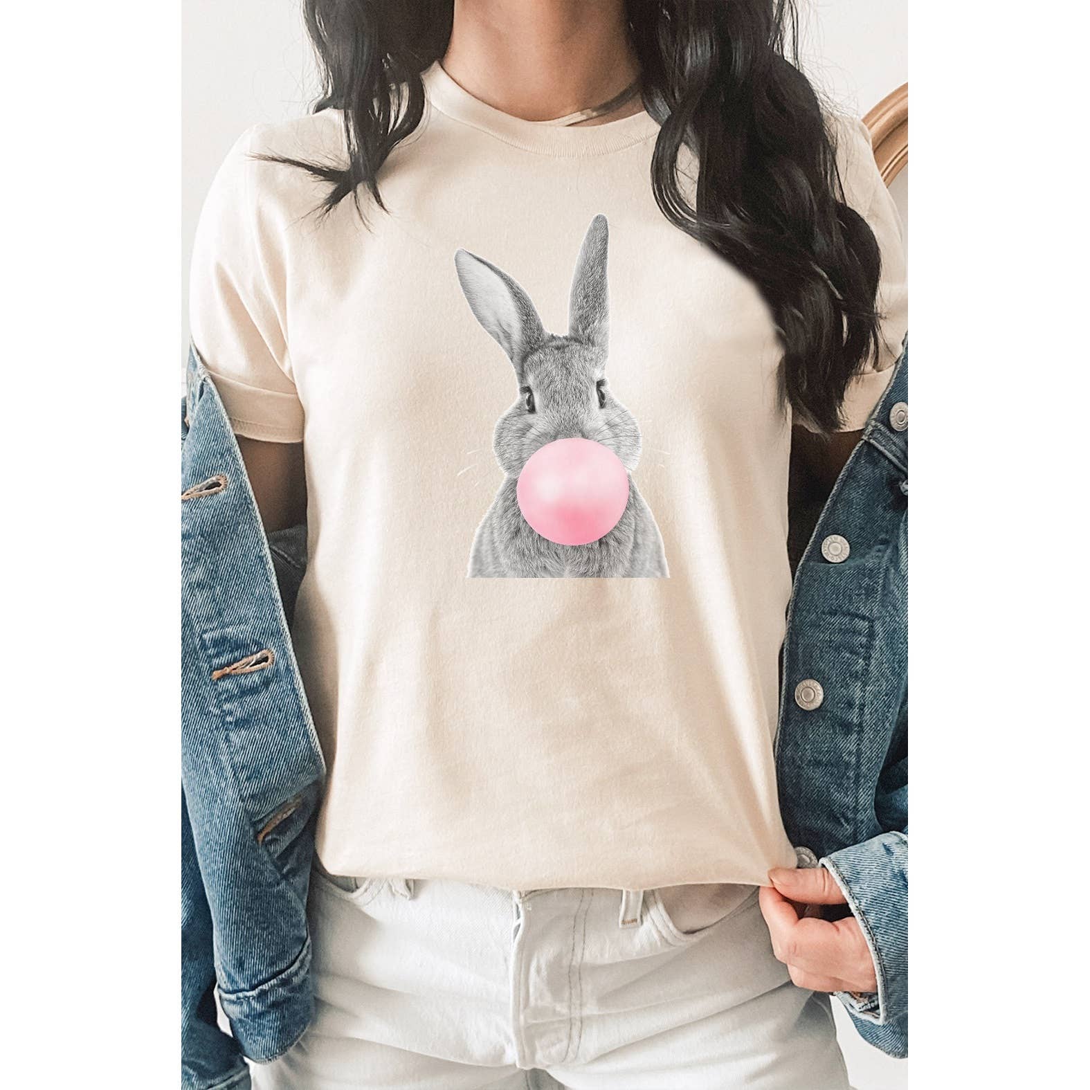 Cute Real Bunny Blowing Bubble Gum Spring, Easter Graphic Tee By Kissed Apparel. White, Cream and Citron tees are 100% cotton, Ash tees are 99/1 cotton/poly. Peach is 52/48 cotton/poly.