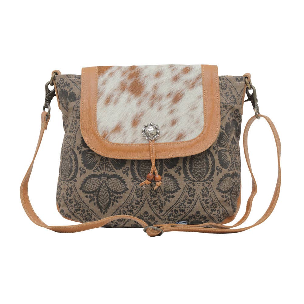 The durable build allows the bag to be ideal for family outings. The design has been inspired from nature and our surroundings Material * Canvas & Hairon Dimensions (in inches) * Width : 13.5 * Height : 10.5 * Shoulder: 22.5 * Depth : 3.5 Care : Dry Clean only. Keep away from water Note:- Cowhide upper is natural and will wear under normal conditions. Each product will vary slightly as each piece of hide will have a unique pattern.