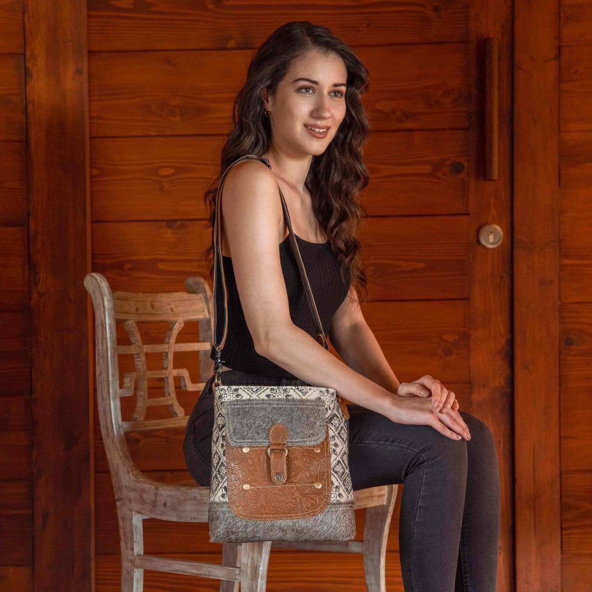 A unique blend of Embossed leather, faux hairon leather, and hand-woven rug form this shoulder bag. With crafty, little inside pockets and a zipper at the back, people who are organized will get a sweet deal