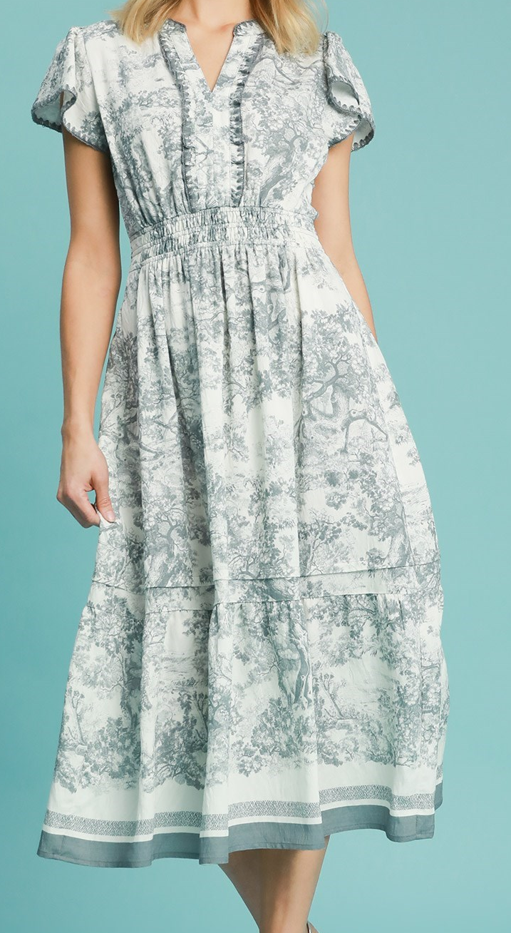 Introducing the Monique Dress – where sophistication meets comfort in a gray toile landscape print that’s practically a work of art! Whether you’re brunching or waltzing at a soirée, this midi-length marvel will have you looking and feeling fabulous (and maybe even a little fancy). Dress up or down, it’s always a win-win!