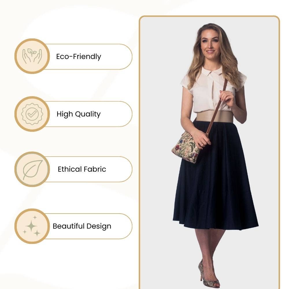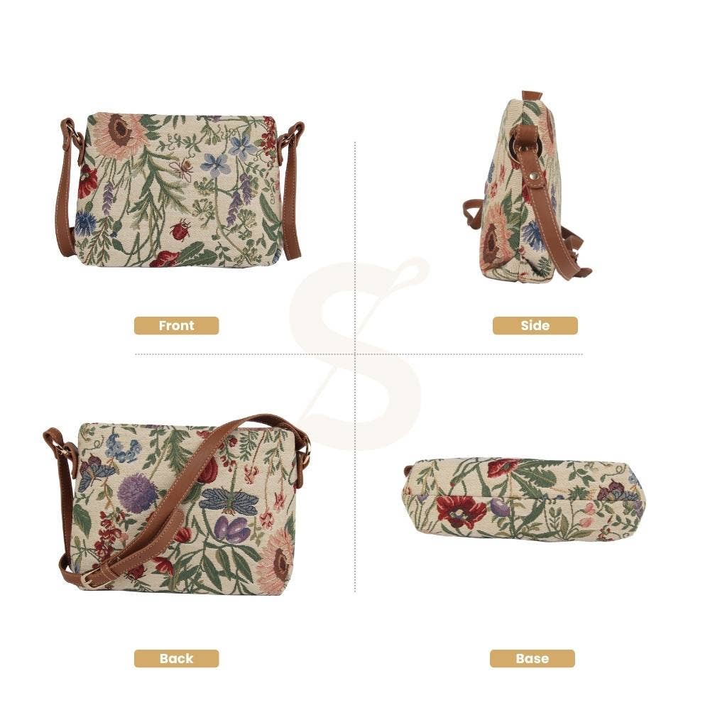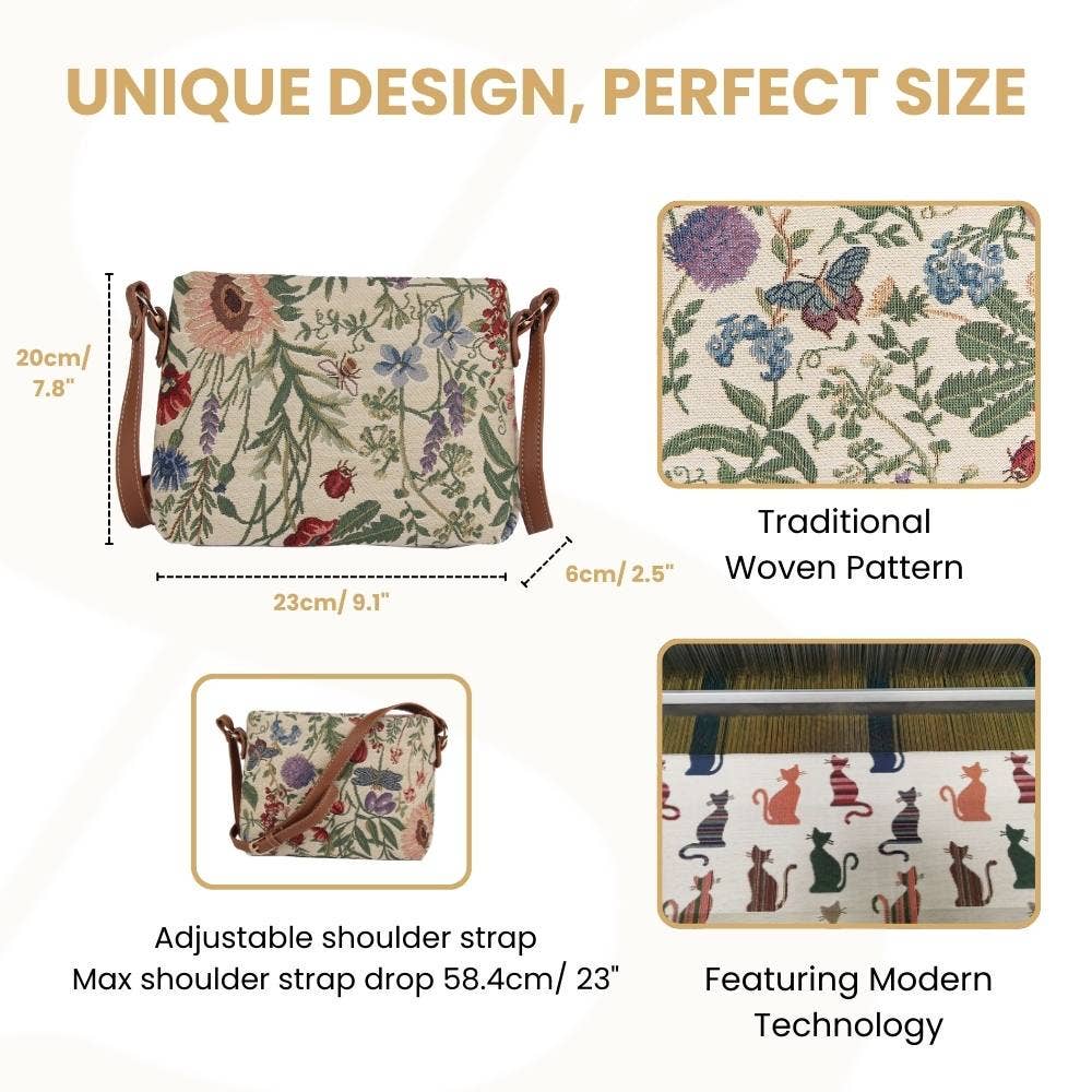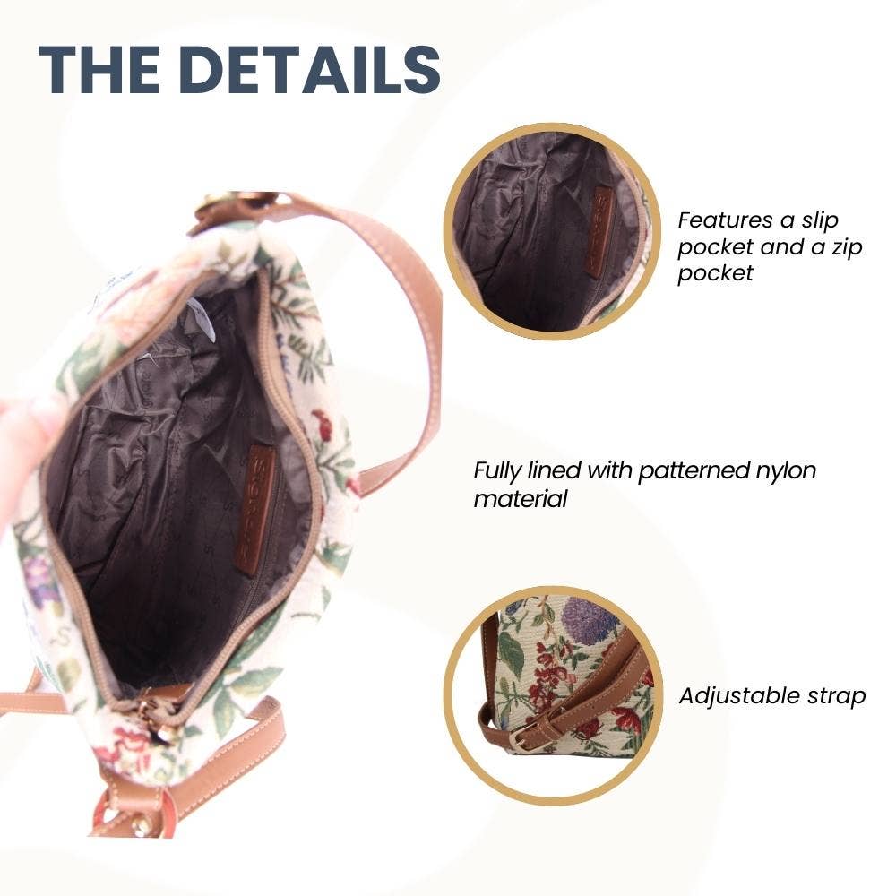 The flora of an English country garden is stunningly reproduced through the tapestry material; creating a detailed pattern in which you can almost smell the fragrance and feel the morning breeze. PRODUCT DESCRIPTION: A nifty tapestry satchel-style bag for ladies. * This crossbody bag is ideal for your daily essentials and it is compactly designed in its appearance * Has the option to be worn as a crossbody or converted into a handbag or shoulder style bag * Fastened with a zip top; the inside features a slip pocket and zip pocket for storage; whilst also containing a modest capacity for make-up and travel accessories * Fitted with an adjustable (up to 22 inches) and buckled faux leather shoulder strap * Size approx. W9.1 x H 7.8 x D2.5 inches - Weight: 0.6 lb [/custom_html]