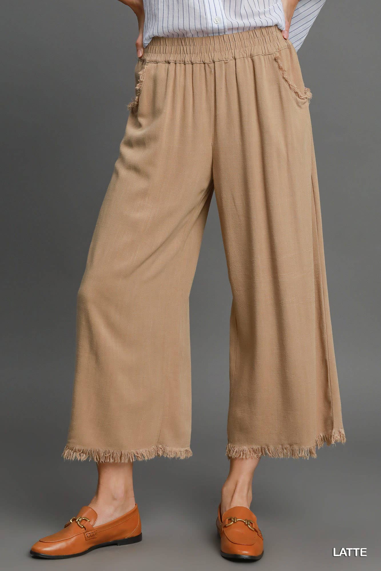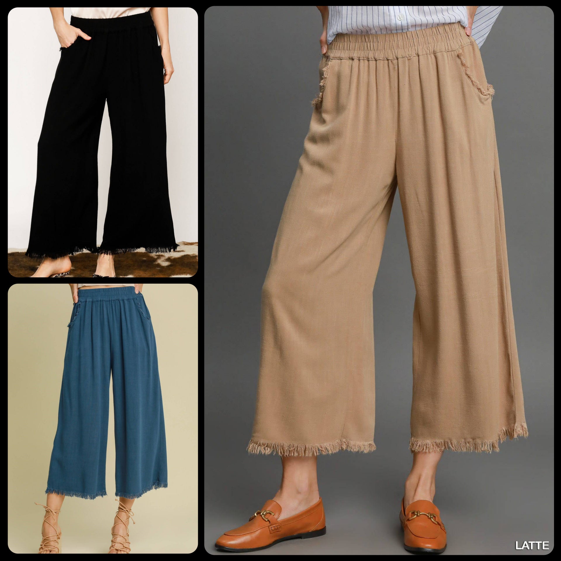 Frayed Hem Wide-Leg Pants in Latte, Black & Slate Blue