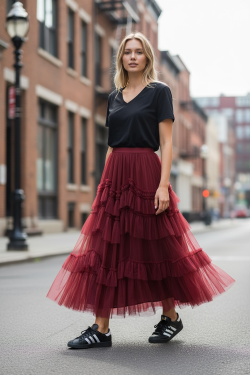 Red Chiffon Tiered Midi Skirt