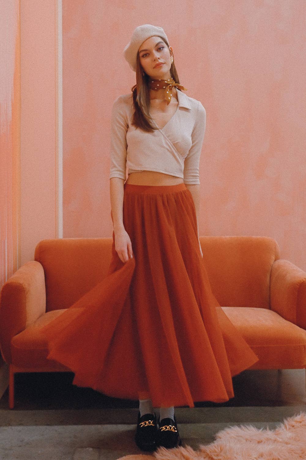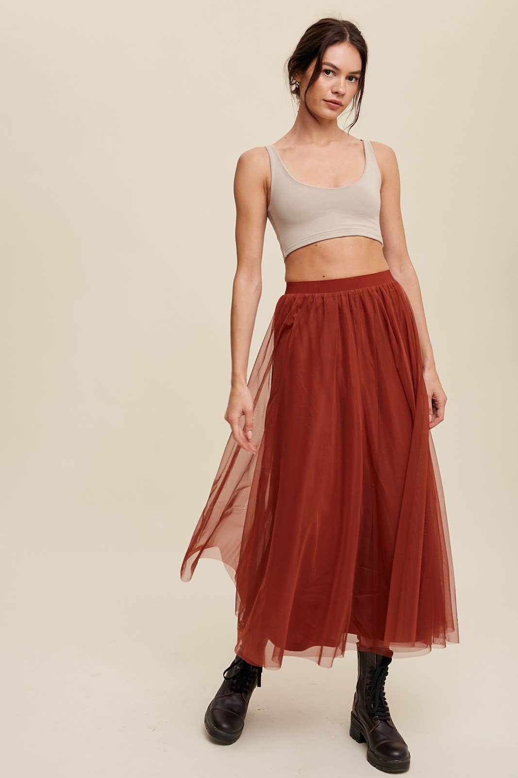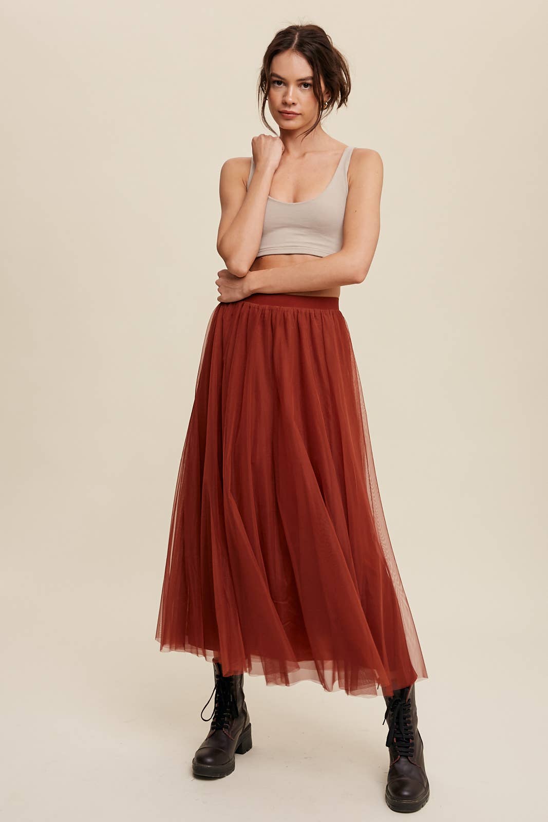 Dreamy Tulle Layers: Crafted with multiple tiers of soft tulle for a voluminous and floaty silhouette - Elastic Waistband: Features a smooth stretch waistband that offers comfort and easy pull-on styling -Midi-to-Maxi Length: Gracefully falls to ankle-length, offering a romantic, airy flow with every step -Fully Lined: Includes a matching inner lining for opacity and all-day wearability - Versatile Styling: Perfect for pairing with chunky boots, sneakers, or dainty heels depending on your mood.  Runs Large.