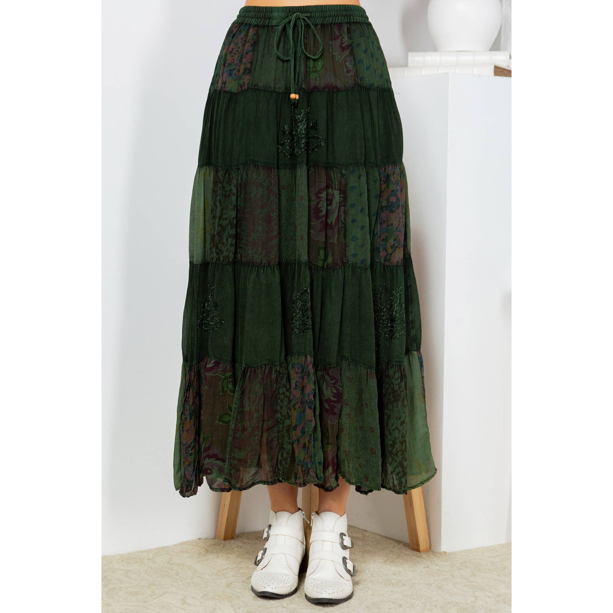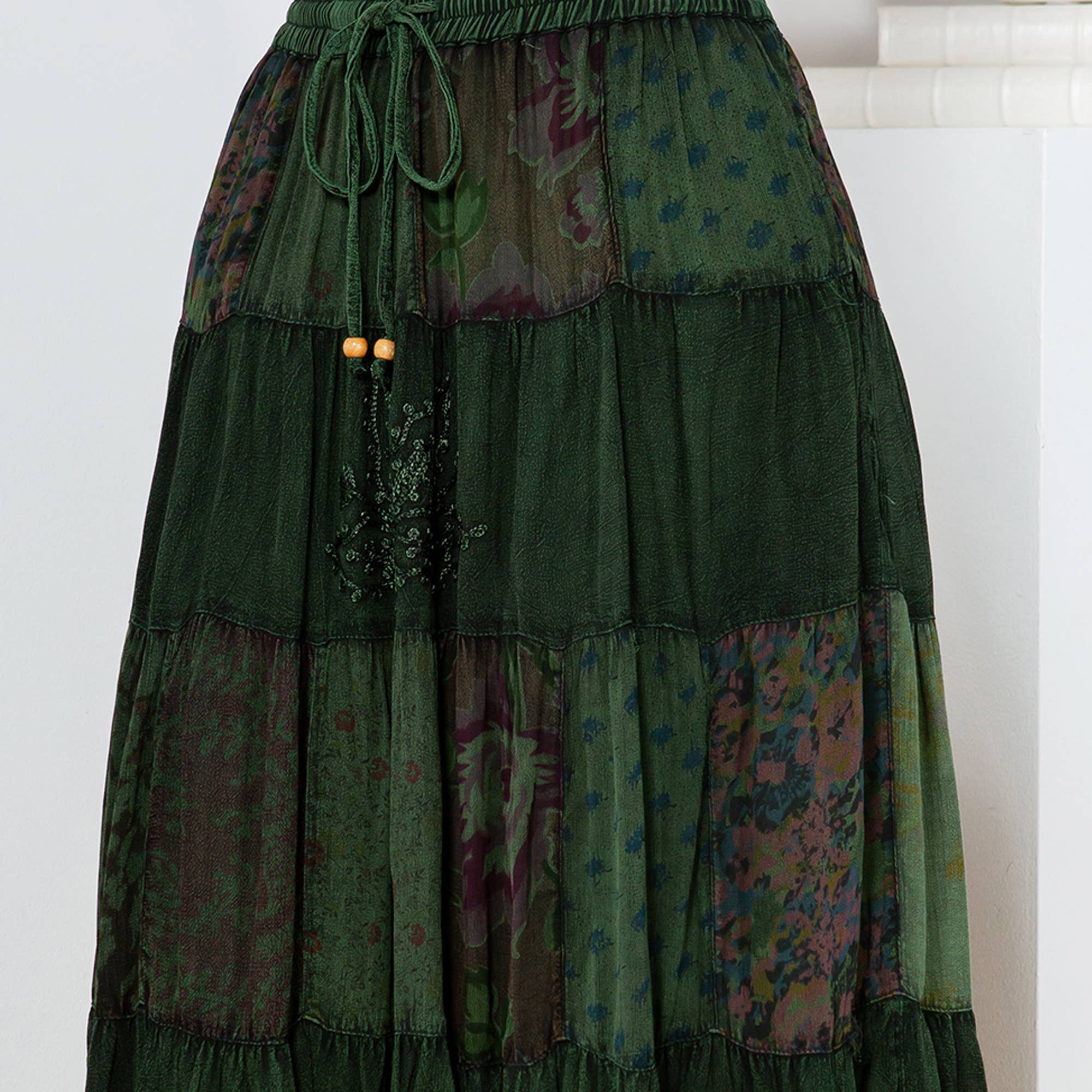 Vintage inspired charm can be all yours with this amazing Deep Green Printed Georgette Patchwork Skirt. Crinkle texture adds depth and dimension. This skirt is overdyed for uniqueness and timeless appeal. Elasticated waist ensures a comfortable fit • Two pockets for added functionality Disclaimer: Due to the unique nature of patchwork design, each product will be unique. So beautiful and comfortable. SMLXL