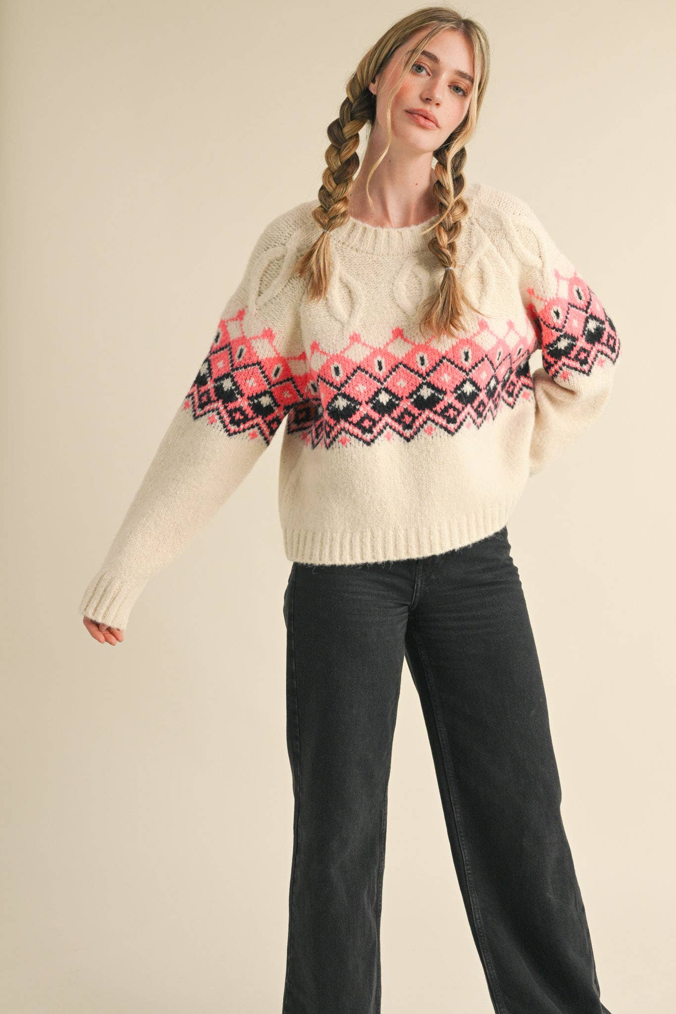 Ivory Cable Knit Fair Isle Sweater