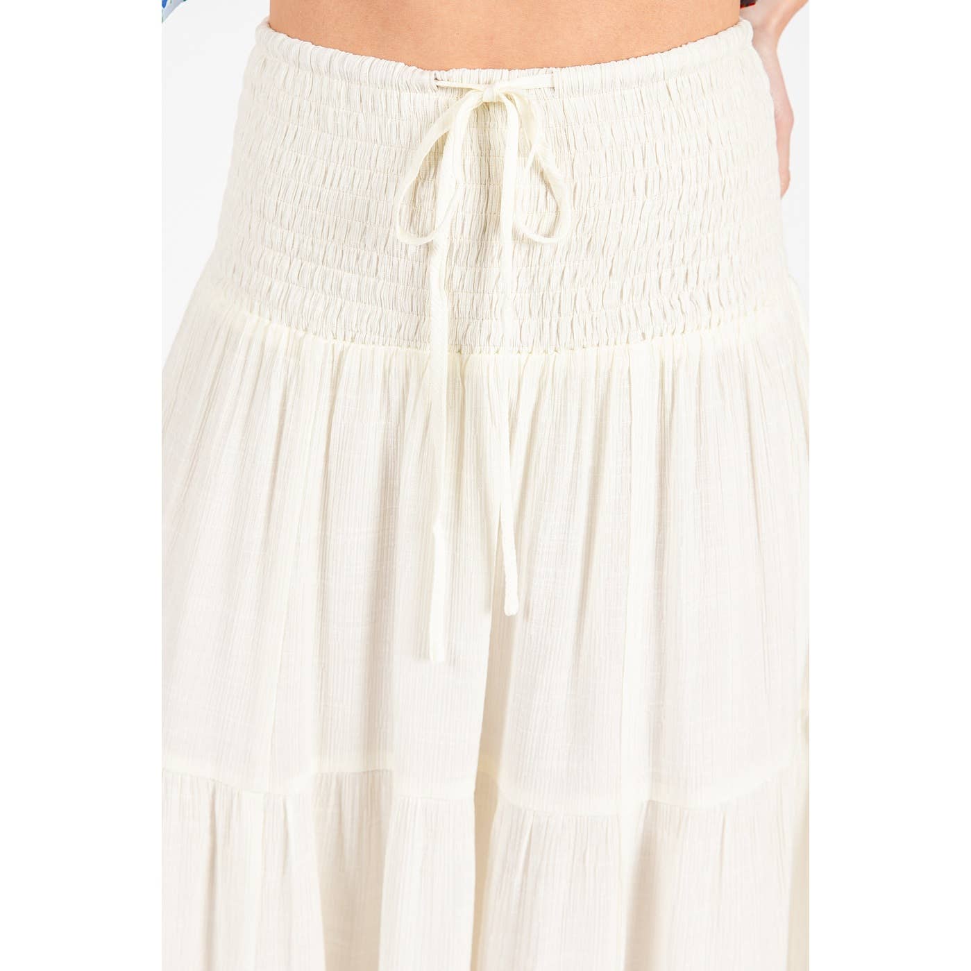 A lightweight, flowing, tiered skirt with a wide smocked waistband will take you right through fall and winter. Fully lined with an attractive crepe-type texture. Pair with heels or boots! Many possibilities for blouses and tops, jackets and cardigans! SML
